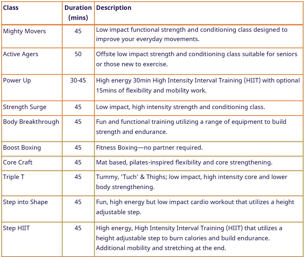 Group Class Timetable
